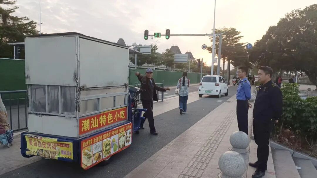 专项整治行动中,执法人员与文明志愿者组成联合工作组,采取 “地毯式” 排查与精准整治相结合的方式,重点对潮文路南北两侧、南滨路沿线及礐石渡口周边等核心区域开展集中治理。为消除市容管理盲区,联合整治队伍还进一步开展夜间行动,对流动摊贩、沿街商户超范围经营等夜间常见乱象进行清理整治。